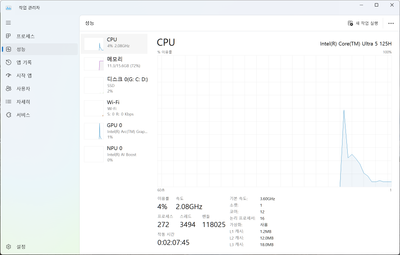 재시작 후, 작업 관리자의 성능 탭을 보면 LP-E 코어가 제외되어